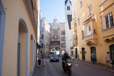 Keywords: old town wasserburg city gate clock tower steeple church motorcycle auto pedestrian city historically building architecture facades renaissance bavaria germany