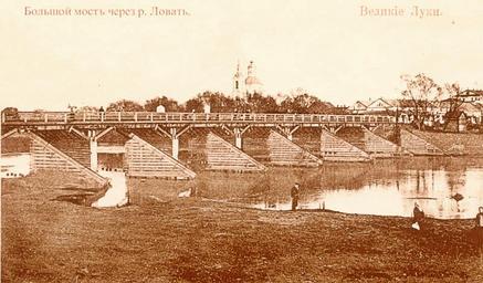 Keywords: Old velikiye luki 2.jpg ru В 1910 году когда было асши ено усло Ловати мост стал семип олётным; хо ошо видны т н «ледо езы» для защиты опо моста от льдин А хив Великолукского К аеведческого музея Author ачало XX в е позднее 1917 года PD-RusEmpire Velikiye Luki PD-old |