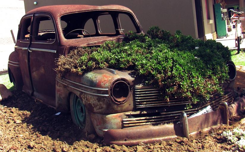 Keywords: old vintage rust car antique retro rusted metal obsolete machine mechanical nostalgia garden succulent green outside outdoors rest