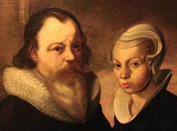 Keywords: Ole Worm og Dorothea.JPG Ole Worm og hans første kone Dorothea Fincke udsnit fra maleri af Worm med familie Nationalmuséet i København own 2012-12 Orf3us Ole Worm Nationalmuseet PD-old-100