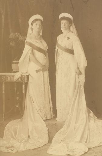 | Keywords: Olga and Tatiana in court gown 1913.jpg en Photograph of Grand Duchess Olga Nikolaevna 1895-1918 and Grand Duchess Tatiana Nikolaevna 1897-1918 They are standing together on a raised platform with Grand Duchess Olga on the left holding a fan Both are wearing court dress including sashes and veils There is a vase of flowers on the ornate table to the left The Grand Duchesses Olga Nikolaevna and Tatiana Nikolaevna were the eldest daughters of Nicholas II Emperor of Russia https //www royalcollection org uk/collection/search /10/collection/2926948/grand-duchesses-olga-nikolaevna-and-tatiana-nikolaevna Royal Collection Trust RCIN 2926948 Boissannas et Eggler St Petersburg 1913 PD-old <gallery>File Olga és Tatjána in court gown 1913 jpg</gallery> Boasson and Eggler Olga Nikolaevna of Russia in family photographs Tatiana Nikolaevna of Russia in family photographs |