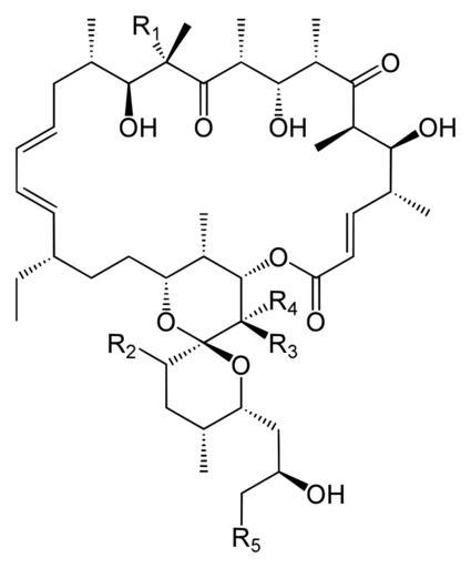 Keywords: Oligomycin gerneral.svg allgemeiner Aufbau von Oligomycin siehe dafür Artikel de general structur of oligomycin see text in the article en own 08 04 08 Yikrazuul Macrolide antibiotics Spiro compounds