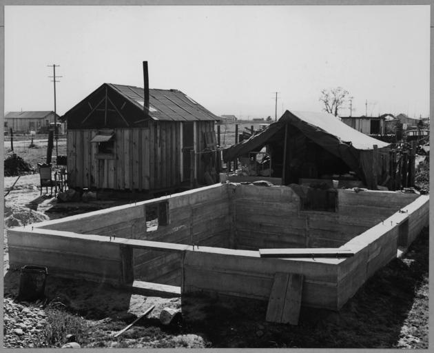 | Keywords: Olivehurst, Yuba County, California. Shows cabin in which this family now lives, and tent (now used . . . - NARA - 521588.jpg Scope and content Full caption reads as follows Olivehurst Yuba County California Shows cabin in which this family now lives and tent now used for overflow in which they originally lived Shows concrete foundation for new house construction of which has been interrupted through lack of funds This family has lived in Olivehurst for three years; on this place for two years It will make a good house if we ever can get any money to go with it My husband built that foundation last Fall Being here in the middle of the fruit when the work starts up maybe we can help ourself General notes 521588 Local identifier 83-G-41347 Department of Agriculture Bureau of Agricultural Economics Division of Economic Information ca 1922 - ca 1953 NARA-Author Lange Dorothea 1895-1965 Photographer 1372774 <br /> Still Picture Records Section Special Media Archives Services Division NWCS-S National Archives at College Park 8601 Adelphi Road College Park MD 20740-6001 1940-03-21 Record group Record Group 83 Records of the Bureau of Agricultural Economics 1876 - 1959 Record group ARC 412 Photographic Prints Documenting Programs and Activities of the Bureau of Agricultural Economics and Predecessor Agencies compiled ca 1922 - ca 1947 documenting the period ca 1911 - ca 1947 Series ARC 521048 File unit File unit ARC Variant control numbers NAIL Control Number NWDNS-83-G-41347 Other versions <gallery> File Olivehurst _Yuba_County _California _Shows_cabin_in_which_this_family_now_lives _and_tent_ now_used_ _ _ _-_NARA_-_521588 tif tif File Olivehurst _Yuba_County _California _Shows_cabin_in_which_this_family_now_lives _and_tent_ now_used_ _ _ _-_NARA_-_521588 jpg jpg </gallery> NARA-cooperation PD-USGov Cabins in California Dorothea Lange Yuba_County _California NARA images of Yuba County California Black and white photographs of residential buildings Manzanar Black and white photographs of California |
