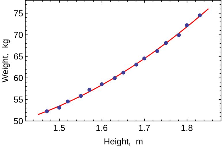 | Keywords: OLS example weight vs height fitted line.svg en Example of OLS regression of weight against height of american women; this picture shows dataset and fitted regression line Own Stpasha 2009-07-05 Source code Mathematica <nowiki> H 1 47 1 50 1 52 1 55 1 57 1 60 1 63 1 65 1 68 1 70 1 73 1 75 1 78 1 80 1 83 ; W 52 21 53 12 54 48 55 84 57 20 58 57 59 93 61 29 63 11 64 47 66 28 68 10 69 92 72 19 74 46 ; Show Plot128 8128 - 143 1620 h + 61 9603 h 2 h 1 45 1 85 PlotStyle -> Thickness0 005 Hue0 PlotRange -> 1 42 1 88 50 78 AxesOrigin -> 1 42 78 Frame -> True FrameLabel -> Height m Weight kg FrameStyle -> DirectiveFontFamily-> Helvetica 14 Thickness->0 003 ListPlotTable Hi Wi i 1 15 PlotStyle -> PointSize0 02 Export wh-fitted svg ;</nowiki> Check categories 2009 July 7 en wikipedia Ordinary_least_squares Control theory 3 Control theory Regression analysis Signal processing |