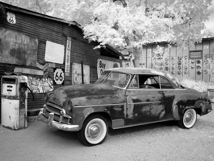| Keywords: oltimer auto crom old automotive usa cromfelgen auto tires mature wheels united states vintage retro north america leave sw black and white infra red retro look black white black and white photo route 66 hackberry route66 arizona gas pump petrol stations supermarket grocery manufacturers |