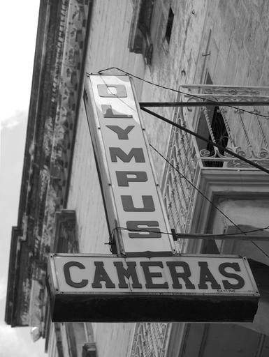 Keywords: olympus logo shield old black and white advertising sign photography camera manufacturer