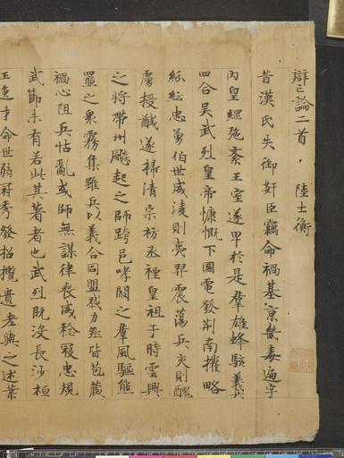 Keywords: On the Fall of States WDL3050.jpg Artwork ru Лу Цзи 261-303 fr Lu Ji 261-303 en Lu Ji, 261-303 zh 陆 , 261-303 pt Lu Ji 261-303 ar لو يي 261-303 es Lu Ji 261-303 ru О падении госуда ств fr De la chute des États en On the Fall of States zh 辩亡论 pt Sobre a Queda dos Estados ar حول سقوط الدول ru Данный полный мануск ипт укописи в емен п авления династии Тан был обна ужен в Дуньхуан Китай Текст написан че нилами на бумаге желтоватого цвета обычным ш ифтом выписан искусными символами и о ганизован в асположенные на большом асстоянии д уг от д уга колонки В мануск ипте соде жится абота озаглавленная <i> О падении госуда ств </i>написанная Лу Цзи 261-303 гг писателем в емен п авления династии Западная Цзинь аписанная по об азцу аботы Цзя И <i> О посещении Цинь </i>она ассказывает о асцвете и падении Восточного Ву в пе иод т оеца ствия а также о заслугах и вкладе семьи Лу В аботе О падении госуда ств кото ая является одной из самых выдающихся д евних абот посвященных воп осам админист и ования и уп авления <i>утве ждается </i> что самым главным факто ом для п оцветания госуда ства является умение оценить и муд о использовать население ст аны По с авнению с текстом п едставленным в <i> Х онике пе иода т оеца ствия </i> и <i> Антологии лите ату ы </i>мануск ипт обна уженный в Дуньхуан соде жит многочисленные ва ианты символов нестанда тные популя ные символы и азличия в фо мули овках Эти изменения наглядно демонст и уют азвитие символов в п оцессе пе еноса текстов а также являются п име ами того как книжники изменяли текст п и пе еписывании в эпоху укописных мануск иптов Данный свиток относится к коллекции мануск иптов дати ованных пе иодом сIV поXI век кото ая была обна ужена в 1900 году в зале Сут ы в пеще е огао; в 1910 году власти Китая аспо ядились чтобы коллекция была пе евезена в Столичную библиотеку кото ая была п едшественницей ациональной библиотеки Китая <br>Изучения Дуньхуан; Династия Тан 618-907 гг ; Династия Западная Цзинь 265-419 гг fr Ce rouleau complet de parchemin de la dynastie des Tang a été exhumé à Dunhuang en Chine Le texte est écrit à l'encre sur du papier jaunâtre en écriture standard dans des colonnes régulièrement espacées avec des caractères magnifiques Le rouleau contient un ouvrage intitulé <i>De la chute des États </i>par Lu Ji 261-303 un écrivain de la dynastie des Jin occidentaux Calqué sur <i>l'œuvre de Jia Yi Sur une visite à Qin </i>le document décrit l'ascension et la chute du royaume oriental de Wu durant la période des Trois Royaumes ainsi que les contributions méritantes de la famille Lu Célèbre parmi les ouvrages antiques sur l'administration <i>De la chute des États</i> fait valoir que la clé de la fortune d'un pays est d'évaluer et employer les personnes à bon escient Par rapport au texte tel qu'il est présenté dans l' <i>Histoire des Trois Royaumes</i> et l' <i>Anthologie littéraire </i>le manuscrit découvert à Dunhuang présente de nombreuses différences dans les caractères employés des caractères populaires non standards et dans les formulations Ces changements montrent l'évolution des caractères dans le processus de transmission des textes et sont un exemple de la façon dont les scribes modifiaient les textes écrits durant l'ère du manuscrit Le rouleau fait partie d'une collection de manuscrits allant du IVe au XIe siècle qui a été découverte en 1900 dans une chambre de sutra des grottes de Mogao ; en 1910 les autorités chinoises ont décidé de transférer cette collection à la Bibliothèque de la Capitale ancêtre de la Bibliothèque nationale de Chine <br>Études de Dunhuang; Dynastie Tang 618-907; Dynastie Jin occidentale 265-419 en This complete scroll of a Tang dynasty manuscript was unearthed in Dunhuang China The text is written in ink on yellowish paper in a regular script in well-spaced columns with beautiful characters The scroll contains a work entitled <em>On the Fall of States</em> by Lu Ji 261-303 a writer of the Western Jin dynasty Modeled on Jia Yi s <em>On a Visit to Qin</em> it describes the rise and fall of the Eastern Wu in the Three Kingdoms period as well as the meritorious contributions of the Lu family Famous among ancient works on administration <em>On the Fall of States</em> argues that the key to a country's fortunes is to assess and employ people wisely Compared with the text as presented in the <em>Record of the Three Kingdoms</em> and the <em>Literary Anthology</em> the manuscript unearthed at Dunhuang has numerous variant characters nonstandard popular characters and differences in wording These changes show the evolution of characters in