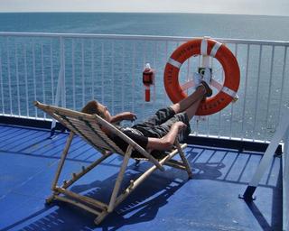 Keywords: on lake on deck sun deck stena ferry relax sun rest stena jutlandia sweden ferry baltic sea sea on bord deck chair holiday summer sunbathing relaxation holidays silent boy