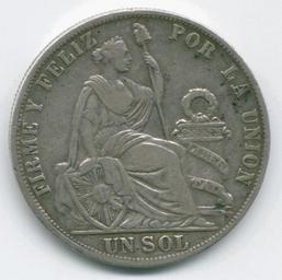 | Keywords: One-sol-1892-(01)-front.png 2005-08-31 own assumed Haylli es Anverso de una pìeza de un sol Perú de plata emitida en 1892 por el Banco Central de Reserva del Perú La imagen contiene una matrona que es alegoría de la República del Perú Se lee la divisa nacional Firme y Feliz por la Unión Especimen monetario escaneado por Haylli en agosto de 2005 Imagen en el Dominio Público debido a la antigüedad de la pieza 1892 coins Coins of Peru Obverses | ||||