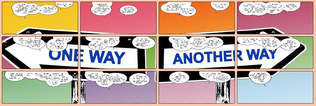 Keywords: one way street template cartoon decisions right smart aleck directions silhouettes human balloons nonsense opportunity chance point of view alternative road sign shield note street sign direction away signpost comic templates