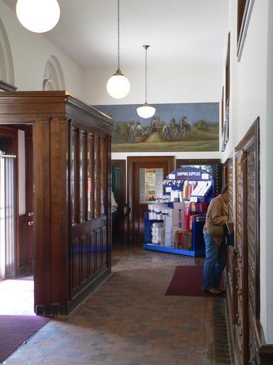 Keywords: O'Neill, Nebraska post office interior 1.JPG U S Post Office in w O'Neill Nebraska ; camera is facing south The Colonial Revival building was constructed in 1936 It is listed in the National Register of Historic Places The vestibule at left leads to the main east entrance On the south wall is a mural by Eugene Trentham titled Baling Hay in Holt County in the Early Days installed in 1938 own Ammodramus 2010-06-15 Pictures by Ammodramus Taken with Panasonic Lumix DMC-FZ20 O'Neill Nebraska post office Murals in Nebraska |