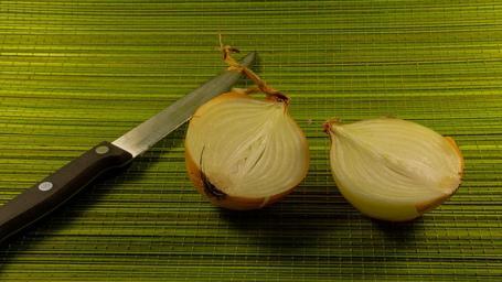 Keywords: onion food cooking knife vegetable half halves cuisine fresh ingredient raw uncooked freshness cut cry tears preparation skin peel chop