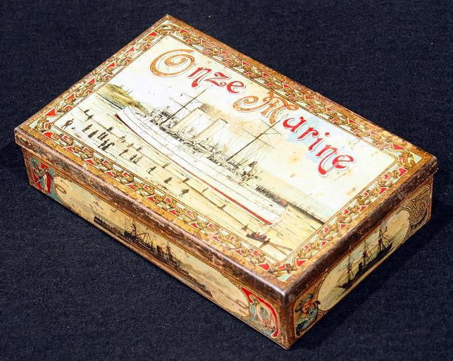 | Keywords: Onze Marine cigarenblik, foto 1.JPG Very old packaging of a Dutch product that is not produced and/or not sold any more Photographed at a collector of Droste memorabilia and old tin cans Rechthoekig scharnierend deksel Op alle zijden een schip zowel stoomschepen als zeilschepen in goud rood en blauw Elke voorstelling omrand met attributen uit de marine ankers stuurwiel reddingboei sabels vaandel Deksel 'Onze Marine/H M Zeeland Zijkant voor 'H M Koningin Wilhelmina der Nederlanden' Zijkant achter 'H M Pantserschip Piet Hein' Zijkant rechts 'H M Fregat Joh Wil Friso For more info see http //www tincollectors nl/ tincollectors nl or email info tincollectors nl own 2014-04-11 11 51 29 Alf van Beem CC-Zero Trademarked Cigar tins Onze Marine cigars |