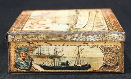 | Keywords: Onze Marine cigarenblik, foto 6.JPG Very old packaging of a Dutch product that is not produced and/or not sold any more Photographed at a collector of Droste memorabilia and old tin cans Rechthoekig scharnierend deksel Op alle zijden een schip zowel stoomschepen als zeilschepen in goud rood en blauw Elke voorstelling omrand met attributen uit de marine ankers stuurwiel reddingboei sabels vaandel Deksel 'Onze Marine/H M Zeeland Zijkant voor 'H M Koningin Wilhelmina der Nederlanden' Zijkant achter 'H M Pantserschip Piet Hein' Zijkant rechts 'H M Fregat Joh Wil Friso For more info see http //www tincollectors nl/ tincollectors nl or email info tincollectors nl own 2014-04-11 12 11 17 Alf van Beem CC-Zero Trademarked Cigar tins Onze Marine cigars |