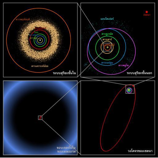 Keywords: Oort cloud Sedna orbit-th.svg These four panels show the location of trans-Neptunian object 90377 Sedna which lies in the farthest reaches of the Solar system <ref>http //www spitzer caltech edu/Media/releases/ssc2004-05/release shtml Most Distant Object in Solar System Discovered Press release Jet Propulsion Laboratory March 15 2004 </ref> Each panel moving clockwise from the upper left successively zooms out to place Sedna in context The first panel shows the orbits of the inner planets and Jupiter; and the asteroid belt In the second panel Sedna is shown well outside the orbits of Neptune and the Kuiper belt objects Sedna's full orbit is illustrated in the third panel along with the object's location in 2004 nearing its closest approach to the Sun The final panel zooms out much farther showing that even this large elliptical orbit falls inside what was previously thought to be the inner edge of the spherical Oort cloud a distribution of cold icy bodies lying at the limits of the Sun's gravitational pull Sedna's presence suggests that the previously speculated inner disk on the ecliptic does exist Thai SVG version of Image Oort cloud Sedna orbit jpg which lists the following sources http //photojournal jpl nasa gov/catalog/PIA05569 http //ipac jpl nasa gov/media_images/ssc2004-05c_medium jpg http //www spitzer caltech edu/Media/releases/ssc2004-05/ssc2004-05d shtml Splitzer Space Telescope Released Images about Sedna March 15 2004 original image August 2006 SVG conversion Image courtesy of NASA / JPL-Caltech / R Hurt Original text courtesy of NASA / JPL-Caltech SVG conversion by Holek Public domain see below English SVG version English JPEG version en Media Ssc2004-05b medium jpg en Media Sedna-NASA JPG en Media 56755main sedna-comp-330-264 jpg French version <references/> The original image PD-USGov-NASA SVG version Oort cloud Sedna |