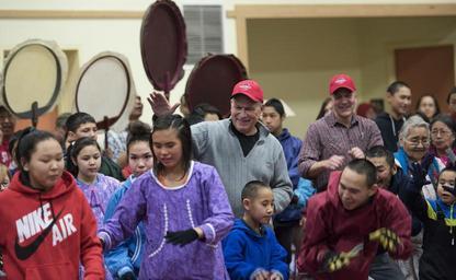 Keywords: military ST. MARY'S, Alaska -- Alaska Gov. Bill Walker (center) and U.S. Senator Dan Sullivan (right) perform a traditional Yup'ik dance with students at the Elicarvicuar Elementary School here Dec. 5, 2015. The two joined a group of about 50 military members and volunteers who traveled here as part of Operation Santa Claus, an Alaska National Guard program to collect toys, school supplies and food staples and deliver them to school children in Alaska's remote communities. This mission was the second and final Op Santa mission of 2015. St. Mary's was the site of the original Operation Santa Claus in 1957. (U.S. Air National Guard photo by Capt. John Callahan/ Released) ST. MARY'S, Alaska -- Alaska Gov. Bill Walker (center) and U.S. Senator Dan Sullivan (right) perform a traditional Yup'ik dance with students at the Elicarvicuar Elementary School here Dec. 5, 2015. The two joined a group of about 50 military members and volunteers who traveled here as part of Operation Santa Claus, an Alaska National Guard program to collect toys, school supplies and food staples and deliver them to school children in Alaska's remote communities. This mission was the second and final Op Santa mission of 2015. St. Mary's was the site of the original Operation Santa Claus in 1957. (U.S. Air National Guard photo by Capt. John Callahan/ Released) |
