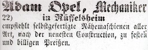 Keywords: Opel Werbeanzeige 1863.jpg Adam Opel aus dem Groß-Gerauer Kreisblatt vom 10  April 1863 Adam Opel ™s first sewing machine advertisement of 1863 Anzeigenblatt des Großherzoglichen Kreisamtes Großgerau 10  April 1863 http //media opel de/content/media/de/de/opel/photos modal 8 id 5724 html/content/dam/Media/images/INTL/opel/history/history-1862-1899/1868-Opel-Ruesselsheim-30997 jpg/1372949165592 html Scan Author 1863-04-10 Adam Opel Mechaniker in Rüsselsheim empfiehlt selbstgefertigte NƤhemaschienen aller Art nach der neuesten Construction zu festen und billigen Preißen 1863 advertisements Opel sewing machines PD-old