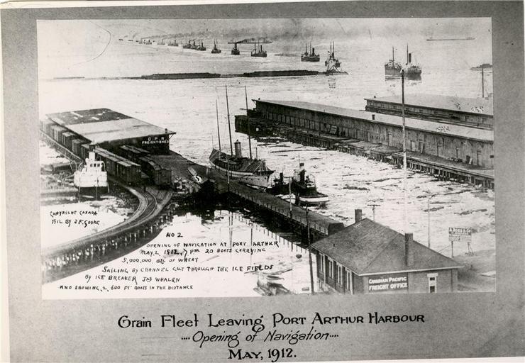| Keywords: archives history steamer steamship great lakes boat ship cargo text photo border drawing Title: Opening of Navigation - Grain Fleet Leaving Port Arthur Harbour Date: May 2, 1912 Creator: Copyright Canada 1912 J. F. Cooke Description: "Opening of Navigation at Port Arthur, May 2, 1912 at 7pm. Twenty boats carrying 5,000,000 BSL of wheat sailing by channel cut through the ice fields by Ice Breaker Jas. Whalen and showing 2, 600 ft. boats in the distance." Canadian Pacific freight office in the foreground, [C.N.R. freight sheds at right], C.P.R. freight shed on left, sign reading "A. Ross & Co.". Reference: Accession 1991-01, Item 184 This photograph is in the public domain as all copyright has expired. For more information about Thunder Bay's history, visit www.thunderbay.ca/archives Title: Opening of Navigation - Grain Fleet Leaving Port Arthur Harbour Date: May 2, 1912 Creator: Copyright Canada 1912 J. F. Cooke Description: "Opening of Navigation at Port Arthur, May 2, 1912 at 7pm. Twenty boats carrying 5,000,000 BSL of wheat sailing by channel cut through the ice fields by Ice Breaker Jas. Whalen and showing 2, 600 ft. boats in the distance." Canadian Pacific freight office in the foreground, [C.N.R. freight sheds at right], C.P.R. freight shed on left, sign reading "A. Ross & Co.". Reference: Accession 1991-01, Item 184 This photograph is in the public domain as all copyright has expired. For more information about Thunder Bay's history, visit www.thunderbay.ca/archives |