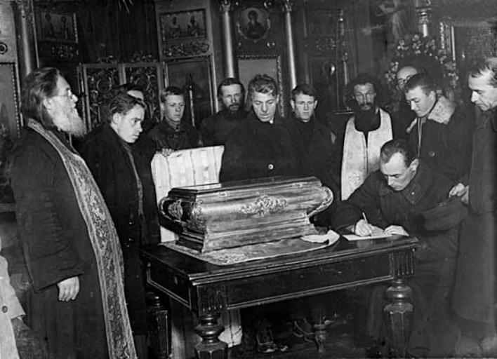 | Keywords: Opening of relics 01.jpg Opening of relics at the church of St Alexander Nevsky Ekaterinburg Rusia Вск ытие мощей в собо е Александ а евского Екате инбу г http //metenkov narod ru/museum/Surin/Surin13 htm s 1920 anonimus PD-Russia-2008 Opening of relics |