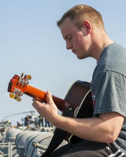 | Keywords: Operation Inherent Resolve 141102-N-TP834-288.jpg en Aviation Ordnanceman 3rd Class Trevor Merrill assigned to the Red Lions of Helicopter Sea Combat Squadron HSC 15 plays guitar during a steel beach picnic on the flight deck of the Nimitz-class aircraft carrier USS Carl Vinson CVN 70 Carl Vinson is deployed in the U S 5th Fleet area of operations supporting Operation Inherent Resolve strike operations in Iraq and Syria as directed maritime security operations and theater security cooperation efforts in the region U S Navy photo by Mass Communication Specialist 2nd Class John Philip Wagner Jr /Released 2014-11-02 Petty Officer 2nd Class john wagner https //www dvidshub net/image/1643651 141102-N-TP834-288 2014-11-04 21 54 USS CARL VINSON CVN 70 AT SEA PD-USGov-Military-Navy USS Carl Vinson CVN-70 flight deck Images from DoD uploaded by Fæ Guitarists |
