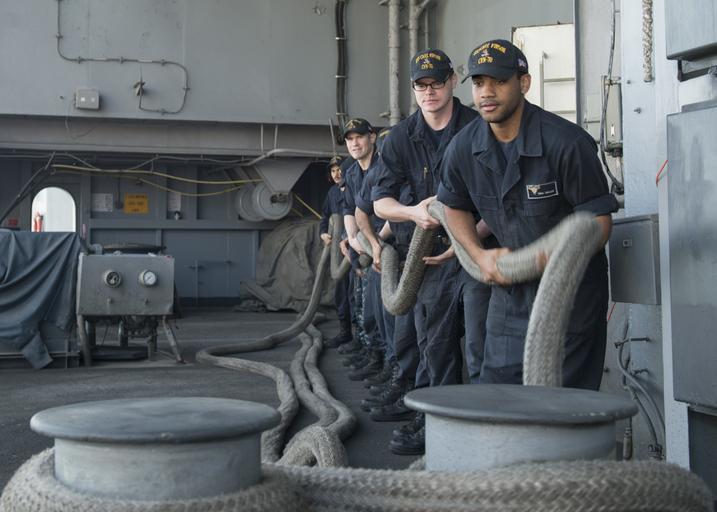 | Keywords: Operation Inherent Resolve 150225-N-KB426-017.jpg en 150226-N-KB426-017 ABU DHABI United Arab Emirates Sailors heave a mooring line on the fantail of the aircraft carrier USS Carl Vinson as the ship makes final preparations to depart Abu Dhabi Vinson is deployed as part of the Carl Vinson Strike Group supporting maritime security operations strike operations in Iraq and Syria as directed and theater security cooperation efforts in the U S 5th Fleet area of responsibility 2015-02-26 Feb 21 2015 https //www dvidshub net/image/1794723 150225-N-KB426-017 2015-03-03 05 44 ABU DHABI AE PD-USGov-Military-Navy USS Carl Vinson CVN-70 Images from DoD uploaded by Fæ |