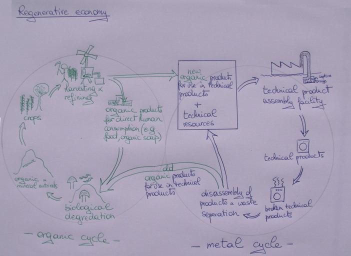 | Keywords: Operation of Regenerative economy.JPG en A schematic showing the operation of a regenerative cradle-to-cradle society The schematic was based on the http //www rsmsymposium com/images/speakers-2008/epea-diagram gif EPEA diagram yet was modified to show the connection between the biological and technical cycle called organic metal cycle in schematic The new organic products for use in technical products include rubber cloth ; in a new computer version of the image this may be added to text own KVDP 2009-06-05 Cradle to Cradle Industrial ecology |