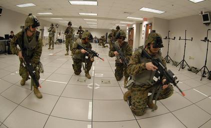 Keywords: Operational Adaptation Integrated Technology Demonstration DVIDS254839.jpg en Marines from the 2d Battalion 8th Marine Regiment train with the Future Immersive Training Environment Joint Capabilities Technology Demonstration virtual reality system in the simulation center at Camp Lejeune N C Sponsored by the US Joint Forces Command with technical management provided by the Office of Naval Research the FITE JCTD allows an individual wearing a self-contained virtual reality system with no external tethers and a small joystick mounted on the weapon to operate in a realistic virtual world displayed in a helmet mounted display 2010-02-24 John Williams https //www dvidshub net/image/254839 100224-N-+++++-204 2010-02-26 00 23 CAMP LEJEUNE NC US PD-USGov-Military-Navy Marine Corps Base Camp Lejeune Office of Naval Research Images from DoD uploaded by Fæ |