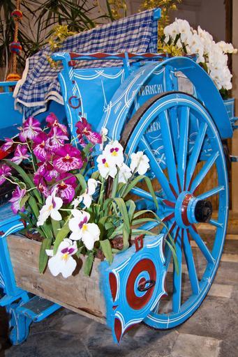 Keywords: orchids dendrobium flora flower blossom bloom white violet wooden cart spoke wheel old antique decorated valuable noble blue