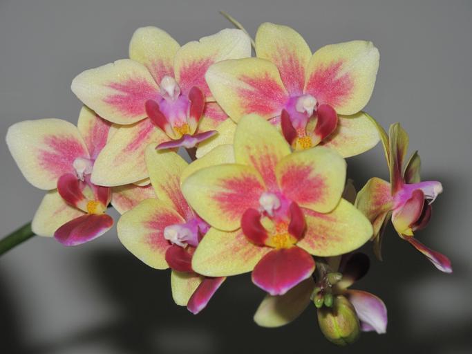 Keywords: orchids flowers blooming plant exotic phalaenopsis flower yellow and pink bouquet macro flora orchidaceae small orchid nature monocotylédone gray background horticulture botany wallpaper