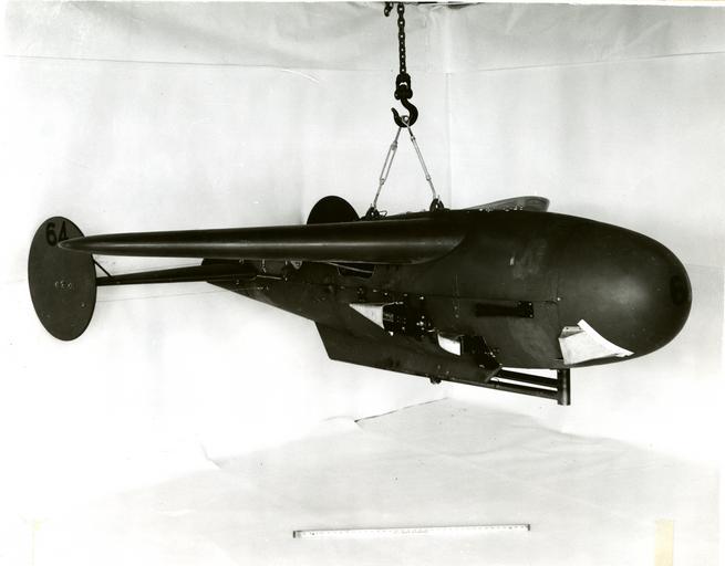 | Keywords: OrdnanceWorldWarII 047.jpg The Pelican was developed concurrently with the Bat by NBS the Navy Bureau of Ordnance and the MIT Radiation Laboratory The Pelican is shown with instrumentation for field testing Directly beneath the wing shown in the photo was mounted a 16mm Bell and Howell Type M-4A gun sight aiming point camera Slightly forward and lower was mounted a 16mm Cine Kodak Model E camera The housing on the nose covered a panel of signal lamps indicating the application of radar controls The cameras simultaneously photographed the panel and the ground ahead of the glider National Institute of Standards and Technology National Institute of Standards and Technology PD-USGov-NIST PD-USGov SWOD Mk-7 Pelican |