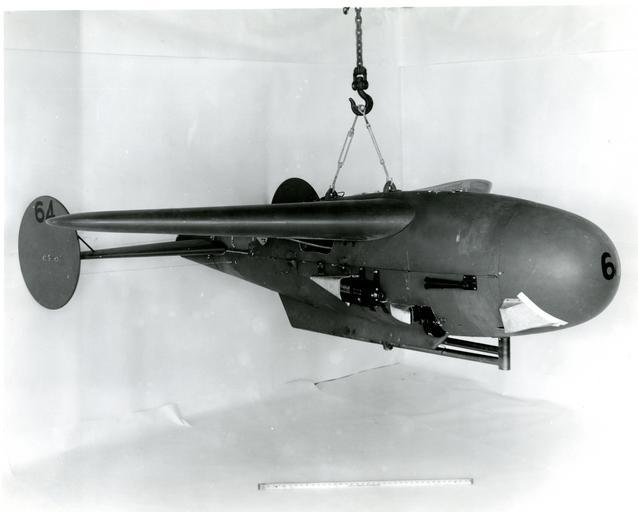 | Keywords: OrdnanceWorldWarII 048.jpg The Pelican was developed concurrently with the Bat by NBS the Navy Bureau of Ordnance and the MIT Radiation Laboratory The Pelican is shown with instrumentation for field testing Directly beneath the wing shown in the photo was mounted a 16mm Bell and Howell Type M-4A gun sight aiming point camera Slightly forward and lower was mounted a 16mm Cine Kodak Model E camera The housing on the nose covered a panel of signal lamps indicating the application of radar controls The cameras simultaneously photographed the panel and the ground ahead of the glider National Institute of Standards and Technology National Institute of Standards and Technology PD-USGov-NIST PD-USGov SWOD Mk-7 Pelican Bell Howell |