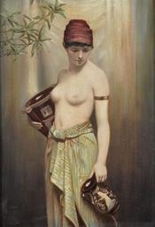 Keywords: Orientalische Wasserträgerin.jpg de Vasenträgerin Version von Max Nonnenbruch Öl auf Holz 20 × 28 cm date Computer digital bearbeitet Creator Max Nonnenbruch other versions PD-old-auto 1922 Uploaded with UploadWizard Max Nonnenbruch Female toplessness in paintings Vases in art |