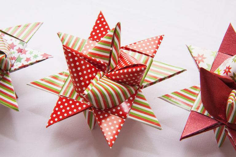 Keywords: origami art of paper folding fold 3 dimensional object star geometric bodies red reddish green stripes points