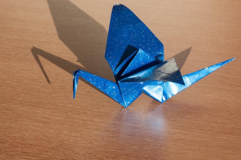 Keywords: origami art of paper folding fold 3 dimensional object crane traditionally geometric body structure paper texture mother of pearl paper blue reflective tinker