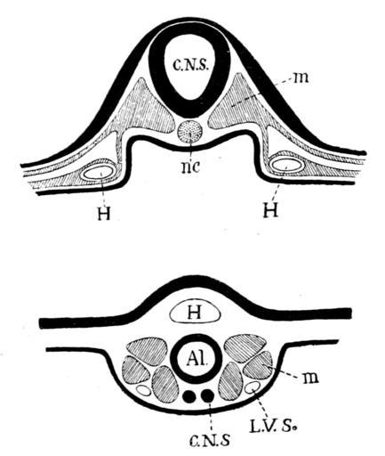 Keywords: Origin of Vertebrates Fig 072.png Fig 72 ”Diagram Upper Half of Figure of the Original Position of Veins H which come together to form the Heart of a Vertebrate C N S central nervous system; nc notochord; m myotome The lower half of figure shows comparative position of the longitudinal venous sinus L V S in Limulus C N S central nervous system; Al alimentary canal; H heart; m body-muscles 1908 The Origin of Vertebrates https //archive org/details/originofvertebra1908gask Walter Holbrook Gaskell PD-old-auto-1923 1914 Origin of Vertebrates book Animal hearts Limulus polyphemus anatomy |