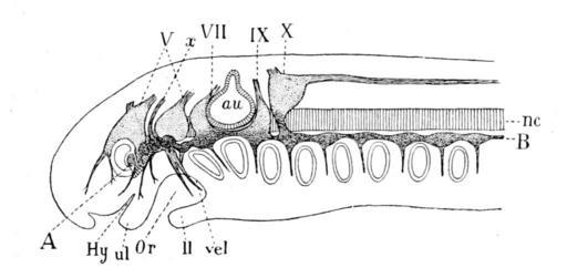 | Keywords: Origin of Vertebrates Fig 113.png Fig 113 ”Ganglia of the Cranial Nerves of an AmmocĹ“tes 4 mm in length projected on to the Median Plane After Kupffer A-B the line of epibranchial ganglia; au auditory capsule; nc notochord; Hy tube of hypophysis; Or oral cavity; u l upper lip; l l lower lip; vel septum between oral and respiratory cavities; V VII IX X cranial nerves; x nerve with four epibranchial ganglia All references in this work to AmmocĹ“tes or Petromyzon appear to refer to the European Brook Lamprey now called Lampetra planeri 1908 The Origin of Vertebrates https //archive org/details/originofvertebra1908gask Walter Holbrook Gaskell PD-old-auto-1923 1914 Origin of Vertebrates book Lampetra planeri |