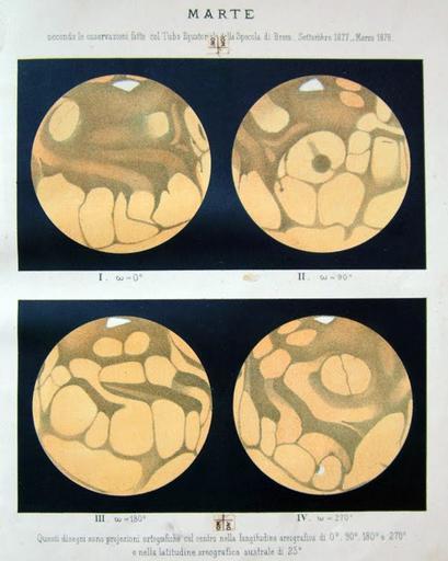 | Keywords: Orthographic views of Mars by Schiaparelli.jpg Τέσσερις ορθογραφικές όψεις του λανήτη Άρη σχεδιασμένες α ό τον ιταλό αστρονόμο Τζιοβάννι Σκια αρέλλι σύμφωνα με αρατηρήσεις ου έκανε στο Παρατηρητήριο της ρέρα α ό το Σε τέμβριο του 1877 έως το άρτιο του 1878 Το κέντρο των όψεων βρίσκεται στο αρεογραφικό μήκος 0° 90° 180° 270° και αρεογραφικό λάτος 25° Four orthographic views of Mars by Giovanni Schiaparelli according to observations he made at Brera Observatory from September 1877 to march 1878 The views are centered on areographic longtitude 0° 90° 180° 270° and areographic latitude 25° http //keespopinga blogspot com/2010/07/schiaparelli-e-la-vita-su-marte html http //4 bp blogspot com/_m0w1jebh02s/TE8yz_nr5pI/AAAAAAAABus/8jKBYOJEMVw/s1600/marte19thcentury jpg file 1888 Creator Giovanni Schiaparelli PD-old-100 Maps of Mars by Giovanni Schiaparelli |