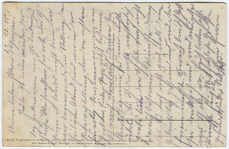 | Keywords: Oscar Tellgmann PC Generalfeldmarschall Graf von Haeseler back side.jpg Generalfeldmarschall Graf von Haeseler Generalfeldmarschall Graf von Haeseler Generalfeldmarschall Graf von Haeseler Text 24 12 15 Meine lieben Eltern Schwester Heute ist nun wieder der Tag gekommen wo ihr lieben Zuhause Weihnachten feiert aber ich kann es leider nicht tun denn wir liegen gerade in Stellung Den Heiligen Abend sind wir in der Reservestellung Aber den ersten Feiertag kommen wir vor im Graben Lieber Papa jetzt besinne ich mich eben auf deinen Geburtstag Nimm es mir nicht übel das ich dir erst nachträglich gratuliere den ich habe mich nicht darauf besonnen Wünsche dir das du noch recht vielmals deinen Geburtstag gesund und munter feiern machst Somit bin ich Gott sei dank gesund und munter was ich auch von euch lieben hoffe Wünsche euch allen gesunde glückliche Weihnachten Mit herzliche Grüße euer Erwin own scan of the original of the postcard in front of me Creator Oscar Tellgmann 1919/ before 1919 PD-old <gallery>File Oscar Tellgmann PC Generalfeldmarschall Graf von Haeseler jpg</gallery> Oscar Tellgmann Gottlieb Graf von Haeseler |