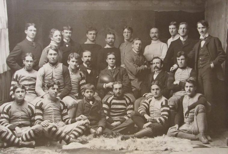 | Keywords: osgoode hall law school osgoodehalllawschool rugby rugby football rugbyfootball law students lawstudents men group portrait groupportrait 1897 stripes monochrome Date: 1897 Photographer: The Bryce Studio Reference code: P829  Depicted are T. Rigney (Coach), C.A. Moss, R. Ayre (Treasurer), W.C. Michell, Fred Wilson, H.V. Duggan, Fred Maclennan, M. White (Trainer), W.A. Hardisty, C. Flood, T.C. Church (Manager), Jack Strathy, W.R. Wadsworth, F. Lorne Cosby, His Honor Judge Morson (Hon. Pres.), Courtney Kingstone (Capt.), J.W. Curry (Pres.), R.H. Parmenter, C.F. Atkinson, G.K. Labatt, "Jimmy" (Mascot), J.D. McMurrich, Joe Syer, N.C. Jones.  Date: 1897 Photographer: The Bryce Studio Reference code: P829  Depicted are T. Rigney (Coach), C.A. Moss, R. Ayre (Treasurer), W.C. Michell, Fred Wilson, H.V. Duggan, Fred Maclennan, M. White (Trainer), W.A. Hardisty, C. Flood, T.C. Church (Manager), Jack Strathy, W.R. Wadsworth, F. Lorne Cosby, His Honor Judge Morson (Hon. Pres.), Courtney Kingstone (Capt.), J.W. Curry (Pres.), R.H. Parmenter, C.F. Atkinson, G.K. Labatt, "Jimmy" (Mascot), J.D. McMurrich, Joe Syer, N.C. Jones. |