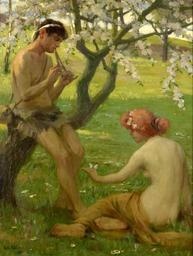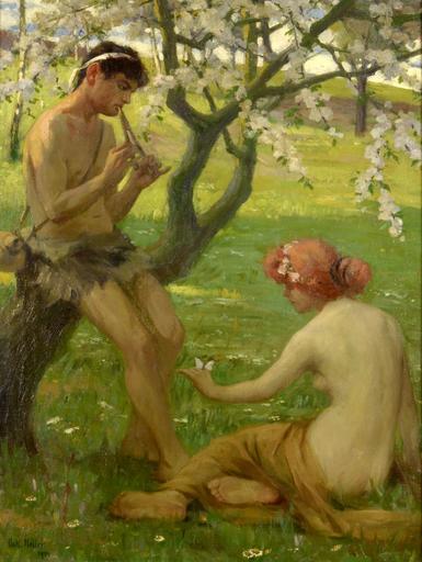 Keywords: Oskar Heller - Frühling - Paar im Apfelgarten.jpg Artwork Oskar Heller 1870 1938 langSwitch Jarní krajina s rozkvetlou jabloní hochem hrajícím na Panovu flétnu a sedící dívkou s motýlem na natažené ruce Frühlingslandschaft mit blühendem Apfelbaum Flöte spielendem Knaben und sitzendem Mädchen mit Schmetterling auf der Hand Spring landscape with blossoming apple tree and a boy playing Pan s flute and girl sitting and playing with a butterfly 1904 oil canvas cm 75 56 object history credit line Osk Heller 04 ~ lower left signature and date accession number LangSwitch http //www papilio cz/de/archiv php aukce a34 pol 13138 Aukční dům Zezula http //www papilio cz/de/archiv php aukce a34 pol 13138 Auktionshaus Zezula Brno http //www papilio cz/de/archiv php aukce a34 pol 13138 Auction house Zezula Brno PD-old-auto-1923 1938 Oskar Heller Couples in art 1904 paintings Images from Zezula Auction House Paintings of couples sitting outdoors