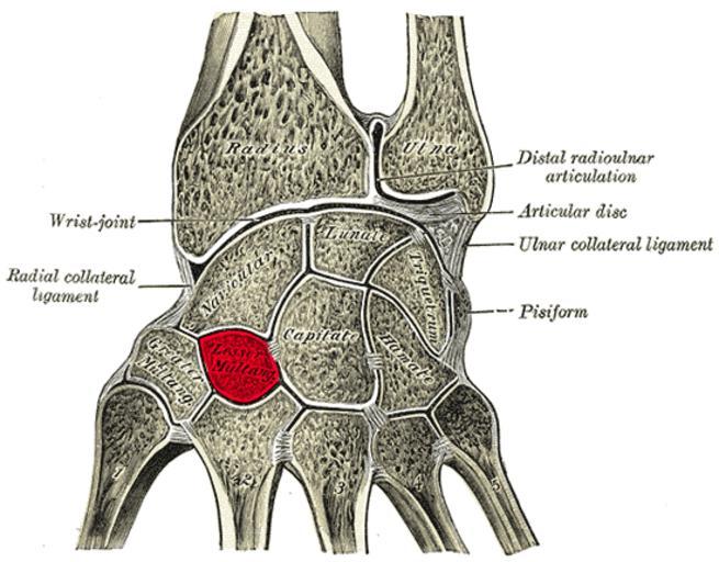 Keywords: Ospoignet - Trapezoid bone.png en wrist bones Trapezoid bone shown in red Trapezoid is labelled as Lesser Multang File Ospoignet gif 2013 Gray thumb left Original Gray's Anatomy plate Trapezoid bone