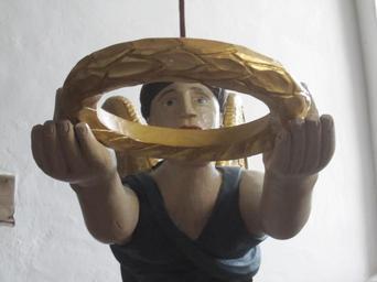 | Keywords: Osterhever – St. Martin-Kirche 10.jpg de Vor dem Gestühl hängt ein großer Taufengel von der Decke herab žVermutlich 1822 wurde ein alter Taufstein durch einen Taufengel ersetzt Im Allgemeinen wurden Taufengel an einem Seil befestigt das über eine Rolle mit einem Gegengewicht verbunden war Wie bei unserem Engel war in der Gürtelregion eine Öse befestigt Mit Hilfe eine Stange mit Haken konnte der Taufengel dann aus seiner erhöhten Position zur Taufhandlung herabgezogen werden So hatte man bei den Gottesdiensten mehr Platz in der Kirche Die Taufschale die in den Kranz den der Engel in seinen Händen hält eingefügt wurde fehlt leider Informationstafel in der Kirche Der Taufengel war bis um 2010 auf dem Dachboden der Kirche eingelagert und wurde nach einer Restaurierung wieder aufgehängt own Klaaschwotzer 2013-09-07 St -Martins-Kirche Osterhever Cc-zero |