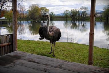 Keywords: ostrich relaxation outdoor lake peaceful grass tree