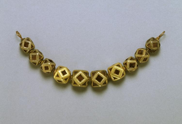 | Keywords: Ostrogothic - Polyhedral Beads - Walters 571746 - View A.jpg These ten beads were probably part of a woman's necklace They are made of thin sheet gold that was cut and folded around a core of pitch pine resin Slices of garnet backed with foil to enhance their brilliance were inserted into the pitch between the gold frames This technique of combining gold and foil-backed garnets is characteristic of the Goths of South Russia century 5 Early Medieval gold with garnets over pitch cm 3 4 9 1 3 accession number 57 1746 21359 Joseph Chmielowski Ochakov Ukraine Joseph Chmielowski Sale Amercian Art Gallery New York February 23-25 1922 lot 710 Henry Walters New York date of acquisition unknown by purchase Sadie Jones Mrs Henry Walters New York 1931 by inheritance Mrs Henry Walters Sale New York December 1-4 1943 lot 537 The Hammer Galleries New York date and mode of acquisition unknown Walters Art Museum September 19 1945 by purchase Museum purchase with funds provided by the S A P Fund 1945 Early Christian and Byzantine Art Baltimore Museum of Art Baltimore 1947 Romans and Barbarians Museum of Fine Arts Boston Boston 1976-1977 Jewelry - Ancient to Modern The Walters Art Gallery Baltimore 1979-1980 Objects of Adornment Five Thousand Years of Jewelry from the Walters Art Gallery Baltimore Cooper-Hewitt National Design Museum New York; Chrysler Museum of Art Norfolk; Carnegie Museum of Art Pittsburgh; San Antonio Museum of Art San Antonio; Philbrook Museum of Art Tulsa; Honolulu Academy of Arts Honolulu; New Orleans Museum of Art New Orleans; Milwaukee Art Museum Milwaukee; Minneapolis Institute of Arts Minneapolis; Toledo Museum of Art Toledo; The John and Mable Ringling Museum of Art Sarasota 1984-1987 Jewelry from the Walters Art Museum and the Zucker Family Collection The Walters Art Gallery Baltimore 1987 place of origin Russia Walters Art Museum license Medieval metalwork in the Walters Art Museum Jewellery in the Walters Art Museum Media contributed by the Walters Art Museum needs category review Ostrogothic jewellery |