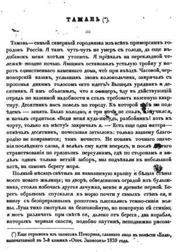 | Keywords: Otechestvennye zapiski 1840 t8 n2 s144.GIF en Scan of the first page of the Mikhail Lermontov's Taman novell; from the first publishing in the Otechestvennye zapiski Patriotic Notes Magazine 1840 Volume 8 No 2 Page 144 Language Russian ru Скан пе вой ст аницы повести ихаила Ле монтова Тамань ; из пе вой публикации в жу нале Отечественные записки 1840 том 8 2 ст 144 Язык усский Google Books Creator Mikhail Lermontov 1840 PD-old-100 A Hero of Our Time 1840 books Magazines of Russia 1840 Otechestvennye Zapiski |