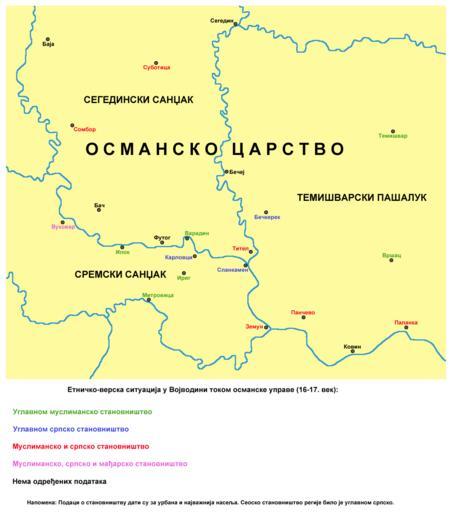 Keywords: Ottoman vojvodina ethnicity religion-sr.png en Ethno-religious situation in Vojvodina during Ottoman administration 16th-17th century sr Етничко-ве ска ситуација у Војводини током османске уп аве 16-17 век own PANONIAN 2014 Cc-zero References / Reference Dr Dušan J Popović Srbi u Vojvodini knjiga 1 Novi Sad 1990 general data about ethnic and religious situation in Vojvodina during Ottoman administration as well as detailed data about population of several settlements - opšti podaci o etničkoj i verskoj situaciji u Vojvodini tokom osmanske uprave kao i detaljni podaci o stanovništvu nekoliko naselja - pages 110-114 212-213 248-263 / strane 110-114 212-213 248-263 Dr Dušan Popov Petrovaradinska tvrđava Enciklopedija Novog Sada knjiga 20 Novi Sad 2002 data about population of Varadin - podaci o stanovništvu Varadina Žarko Dimić Sremski Karlovci Enciklopedija Novog Sada knjiga 26 Novi Sad 2005 data about population of Karlovci - podaci o stanovništvu Karlovaca Marko Jovanov Devet vekova od pomena imena Titela Titelski letopis Titel 2001 data about population of Titel - podaci o stanovništvu Titela Milan Tutorov Banatska rapsodija - istorika Zrenjanina i Banata Novi Sad 2001 data about population of Bečkerek - podaci o stanovništvu Bečkereka Dušan Belča Mala istorija Vršca Vršac 1997 data about population of Vršac - podaci o stanovništvu Vršca Antun Dević - Blaž Zmaić Župa Irig Irig 2010 data about population of Irig - podaci o stanovništvu Iriga Jovan Erdeljanović Srbi u Banatu Novi Sad 1992 data about population of Pančevo - podaci o stanovništvu Pančeva http //www yumreza org yu/irig/Istorija_Iriga/opsti_podaci htm data about population of Irig - podaci o stanovništvu Iriga http //www pancevo com/town/history/ data about population of Pančevo - podaci o stanovništvu Pančeva http //www nocmuzeja rs/Gradovi/Pancevo/Turisticka-organizacija-Panceva data about population of Pančevo - podaci o stanovništvu Pančeva http //digilander libero it/zivoslav/pancevo htm data about population of Pančevo - podaci o stanovništvu Pančeva http //e-zemun rs/zemun/istorija/kratka-istorija-zemuna/ data about population of Zemun - podaci o stanovništvu Zemuna http //diurnarius info/index php/sr/istorija/16-opispalanke data about population of Subotica - podaci o stanovništvu Subotice Place names / Imena mesta wikitable style text-align right - Turkish name<br>Tursko ime Former Serbian name<br>Bivše srpsko ime Modern Serbian name<br>Moderno srpsko ime Names in other languages<br>Imena na drugim jezicima - Segedin Segedin Segedin Szeged Hungarian mađarski - Baya Baja Baja Baja Hungarian mađarski - Sobotka Subotica Subotica - - Sonbor Sombor Sombor - - Baç Bač Bač - - Vukot Futog Futog - - Titel Titel Titel - - Beçe Bečej Novi Bečej - - Beçkerek Bečkerek Zrenjanin - - Temeşvar Temišvar Temišvar Timişoara Romanian rumunski - Verşe Vršac Vršac - - Haram Palanka Banatska Palanka - - Pançova Pančevo Pančevo - - Kufin Kovin Kovin - - Zemlin Zemun Zemun - - Slankamen Slankamen Stari Slankamen - - İrig Irig Irig - - Karlofça Karlovci Sremski Karlovci - - Varadin Varadin Petrovaradin - - Mitroviçe Mitrovica Sremska Mitrovica - - Uyluk Ilok Ilok Ilok Croatian hrvatski - Vukovar Vukovar Vukovar Vukovar Croatian hrvatski Historical maps of ethnic groups in Vojvodina Historical maps of ethnic groups in Serbia Historical maps of religion in Vojvodina Historical maps of religion in Serbia Maps of the history of Banat Maps of the history of Bačka Maps of the history of Syrmia Maps of the Ottoman Empire in the 16th-century Maps of the Ottoman Empire in the 17th-century Maps of the Bosniaks Maps of the Serbs Maps of the Hungarians Maps in Serbian Demographic Maps of the Ottoman Empire |