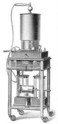 | Keywords: Oudin coil Fleming.png  An early Oudin coil apparatus a resonant transformer circuit similar to a Tesla coil invented by French physician Paul Marie Oudin around 1893 used in the obsolete medical field of electrotherapy during the first decades of the 20th century It generated very high voltage low current high frequency AC current 200 - 1000 kV at frequency between 200 kHz and 2 MHz The high voltage terminal at top is connected through a wire to a handheld electrode lying in front of coil which produced streamer arcs and brush discharges which were applied to the patient's body to treat various medical conditions <br/><br/> It consists of a small horizontal solenoid coil center connected to two Leyden jar capacitors to make a tuned circuit with a spark gap below enclosed in a glass tube to muffle the sound A potential of 3 - 15 kV from an induction coil separate not shown repeatedly charges the capacitors which then discharge through the spark gap and solenoid creating damped radio frequency oscillations The large resonator coil top is connected to a tap on the solenoid coil The resonator acted as a second tuned circuit; theparasitic capacitance between its ends resonates with its large inductance When the tap on the solenoid was adjusted so the primary tuned circuit and the resonator coil had the same resonant frequency large oscillating voltages were induced in the resonator due to its high Q This is an early circuit in later Oudin circuits the two coils were wound on the same axis to make a transformer J A Fleming The Principles of Electric Wave Telegraph and Telephony 2nd ed Longmans Green Co London 1910 1910 J A Fleming PD-OLD Oudin coils |