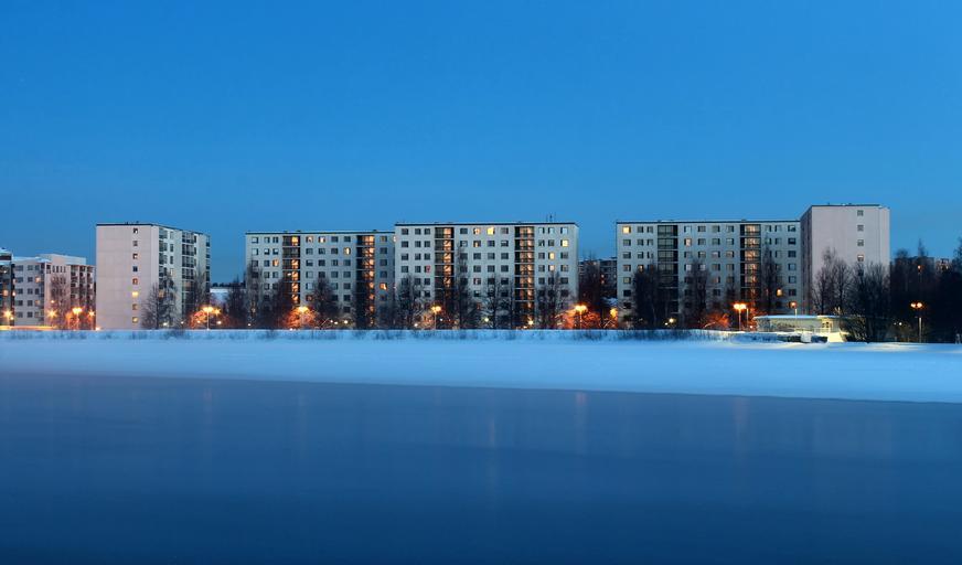Keywords: oulu finland skyline sky buildings winter snow ice frozen lake water dusk evening lights outside city cities