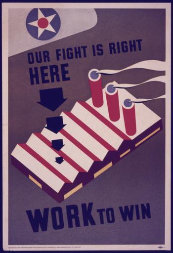 | Keywords: Our Fight to Win is Right Here. Work to Win - NARA - 533989.jpg Scope and content General notes 533989 Local identifier 179-WP-132 Office for Emergency Management War Production Board 01/1942 - 11/03/1945 Still Picture Records Section Special Media Archives Services Division NWCS-S National Archives at College Park 8601 Adelphi Road College Park MD 20740-6001 other date circa 1942 1943 Record group Record Group 179 Records of the War Production Board 1918 - 1947 Record group ARC 508 War Production Board compiled 1942 - 1943 Series ARC 533858 File unit File unit ARC Variant control numbers NAIL Control Number NWDNS-179-WP-132 Other versions <gallery> File Our_Fight_to_Win_is_Right_Here _Work_to_Win_-_NARA_-_533989 tif tif File Our_Fight_to_Win_is_Right_Here _Work_to_Win_-_NARA_-_533989 jpg jpg </gallery> NARA-cooperation PD-USGov World War II posters from the United States |
