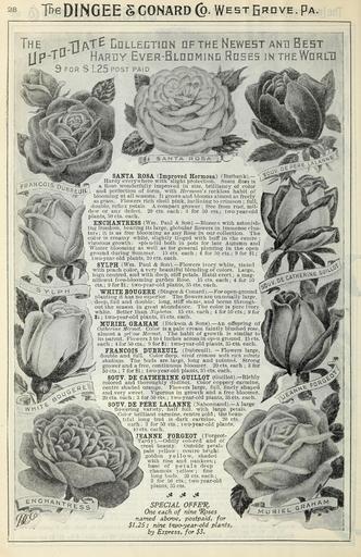 Keywords: Our new guide to rose culture (16384220580).jpg 28 IBeDINGEESCONARDCb WESTERnvE pA <br> The rttlA' CnLLEGTiDN df the Newest anuB <br> UP <br> r fw 9 FOR S 25 POST PAID <br> EST <br> WnRLU <br> SANTA ROSA Improved Hermosa rBurbank <br> Hardy everywhere with slight protection Sania Rosa is <br> a Rose wonderfully improved in size brilliancy of color <br> and perfection of form with Hermnsa's reckless habit of <br> blooming at all seasons It grows and blooms almost as freely <br> as grass Flowers rich shell pink inclining to crimson ; full <br> ilouble reflex petals A compact grower; free from rust mil- <br> 'lew or any defect 20 cts each; 3 for 50 cts ; two-year-old <br> I'lants 50 cts each <br> ENCHANTRESS Wm Paul Son ” Blooms with astonish- <br> ing freedom bearing Its large globular flowers in Immense clus- <br> c rs; it is as free blooming as any Rose in our collection The <br> v is creamy white slightly tinged with buff in the centre ; <br> i orous growth; splendid both in pots for late Autumn and <br> Winter blooming as well as for general planting in the open <br> -cround during Summer 15 cts each ; 4 for 50 cts ; 9 lor SI ; <br> Lwo-yearold plants 30 cts each <br> SYLPH Wm Paul Son ” Flowers ivory white tinted <br> with peach color a very beautiful blending of colors Large <br> high centred and with deep stiff petals Habit erect ; a mag- <br> nificent free-blooming garden Rose 15 cts each; 4 for £0 <br> cts ; 9 for 1; two-year-old plants 35 cts each <br> WHITE BOTJGERE Dingee Conard ” Foropen-groimd <br> planting it has no superior The flowers are unus ually large <br> deep full and double; long stiff stem-; and borne througli- <br> out the season in great abundance The color is pure ivory <br> white Better than Niphetos 15 cts each; 4 for 50 cts ; 9 for <br> i ; two-year-old plants 35 cts each <br> MURIEL GRAHAM Dickson Sons ” An offspring ofj <br> Catherine Mermet Color is a pale cream faintly blushed rose <br> almost a yd'ow Mermet The habit of growth is similar to <br> its parent Flowers 3 to 4 inches across in open ground 15 cts <br> each ; 4 for 50 cts ; 9 for 8;; two-year-old plants 35 cts each <br> FRANCOIS DUBRETJIL Dubreuil -Flowers large <br> double and full Color deep vivid cri7n -on with rich velveti/ <br> shadings The buds are large long and pointed Strong <br> grower and a free continuous bloomer 20 cts each ; 3 for <br> 50 cts ; 7 for 1; two-year-old plants 35 cts each <br> SOUV DE CATHERINE GUILLOT GuiUot -Richly <br> colored and thoroughly distinct Color coppery carmine <br> centre shaded orange Flowers large full finely shaped <br> and very sweet Vigorous in growth and a free bloomer <br> 20 cts each; 3 for 50 cts ; two-year-old plants 35 cts each <br> SOUV DE PERE LALANNE Nabonnand -A large <br> - __ flowering variety half full with large petaK - <br> ~~ x Color brilliant carmine centre gold ; the beau- <br> \ t it'll I long bud is dark carmine 20 cts <br> ich ; 3 for 50 cts ; two-year-old plants <br> i ' cts each <br> JEANNE FORGEOT Forgeot- <br> 't Him <br> - <br> - <br> / <br> ardy ”Oddly colored and <br> 'reat beauty Outside petal- <br> pale yellow; centre brigh' <br> golden yellow shaded <br> with rose and nankeen ; <br> base of petals deep <br> chamois yellow ; fine <br> long buds 20 cts each ; <br> 3 for 50 cts ; two-year-old <br> plants 35 cts <br> i t <br> SPECIAL OFFE <br> One each of nine J ses <br> named ab yve postpaid for <br> 1 25 ; nine t wo-year-oId plants <br> by Express for 3 <br> P <br> <br> HA <br> Bk 43875615 149643 77861 Page 28 Text http //www biodiversitylibrary org/page/43875615 1891 10 5962/bhl title 77861 Dingee Conard Co ; Henry G Gilbert Nursery and Seed Trade Catalog Collection NameFound Hermosa NameConfirmed Hermosa NameBankID 4192544 NameFound Sania NameConfirmed Sania EOLID 10696116 NameBankID 4582407 Biodiversity Heritage Library Our new guide to rose culture 1900 Garden Stories Catalogs Dingee Conard Co Flowers Nurseries Horticulture Nursery stock Roses Seeds Trade catalogs U S Department of Agriculture National Agricultural Library bhl page 43875615 dc identifier http //biodiversitylibrary org/page/43875615 bhlGardenStories Ever Blooming Roses BHLinbloom dingee conard co nurseries horticulture u s department of agriculture national agricultural library bhlgardenstories ever blooming roses bhlinbloom Information field Flickr posted date ISOdate 2015-02-18 Check categories 2015 August 24 CC-BY-2 0 BioDivLibrary https //flickr com/photos/61021753 N02/16384220580 2015-08-24 03 52 00 cc-by-2 0 PD-old-70-1923 Our new guide to rose culture 1891 Photos uploaded from Flickr by Fæ using a script
